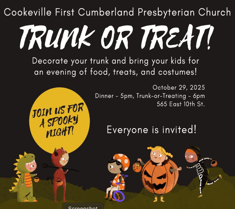 Everyone is welcome and encouraged to join us for Trunk or Treat! We’ll have a Soup & Chili Dinner at 5:00 p.m., followed by Trunk or Treat at 6:00 p.m. Please consider decorating your car or truck and handing out candy.