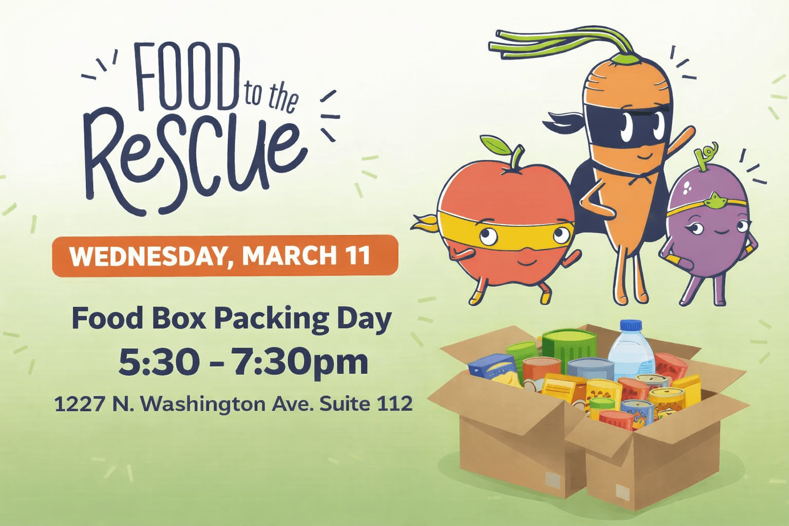 Join us on Wednesday, March 11th from 5:30-7:30pm as we pack boxes that will help to feed children and families during Spring Break. There will be a variety of jobs available for all ages and physical abilities. We meet at 1227 N. Washington Ave. Suite 112.